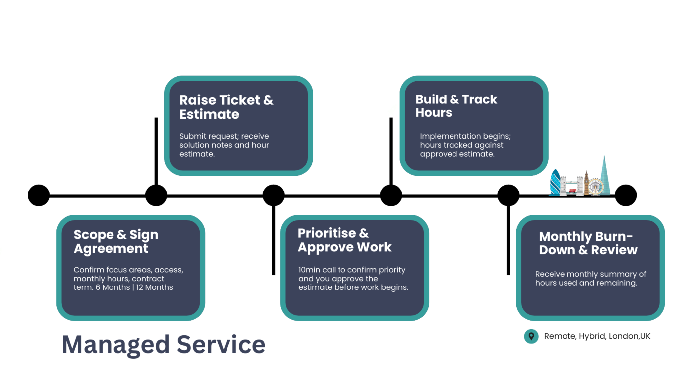 Delivered as a clearly defined, timeboxed engagement, with further build or advisory support available if required.